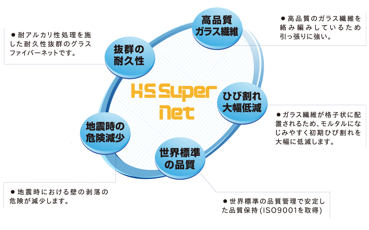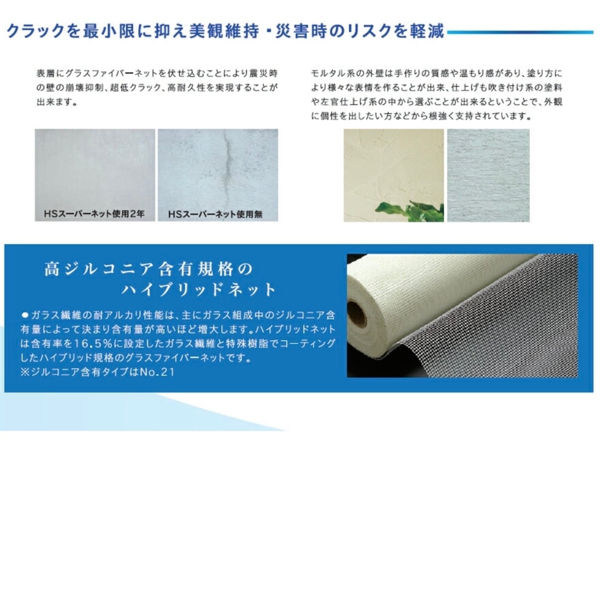 HSスーパーネットは、耐アルカリ性・耐酸性処理を施した高耐久性のガラス繊維を用いたネットです。湿式外壁全面又は、部分補強でモルタルのクラック抑制に威力を発揮します。